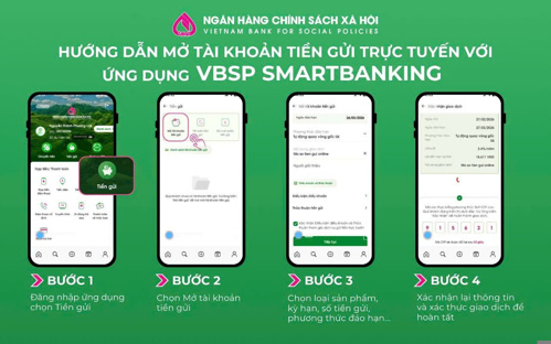 Để sử dụng dịch vụ gửi tiền tiết kiệm online, khách hàng chỉ cần đăng ký sử dụng ứng dụng VBSP SmartBanking tại Phòng giao dịch NHCSXH hoặc thông qua sự hướng dẫn của cán bộ ngân hàng và Tổ tiết kiệm và vay vốn. Sau khi đăng ký, khách hàng có thể chủ động thực hiện các giao dịch gửi tiền tiết kiệm trực tuyến một cách thuận tiện và nhanh chóng.