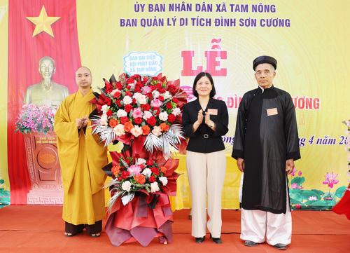 Đại đức Thích Đạo Giác - Trưởng Ban đại diện Giáo hội Phật giáo Việt Nam xã Tam Nông tặng hoa chúc mừng