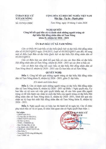 BBT TRANG THÔNG TIN ĐIỆN TỬ XÃ TAM NÔNG XIN TRÂN TRỌNG GIỚI THIỆU: NGHỊ QUYẾT SỐ 03 CỦA UBBC XÃ TAM NÔNG NGÀY 18/3/2026 CÔNG BỐ KẾT QUẢ BẦU CỬ VÀ DANH SÁCH NGƯỜI TRÚNG CỬ ĐẠI BIỂU HĐND XÃ KHÓA II, NHIỆM KỲ 2026-2031