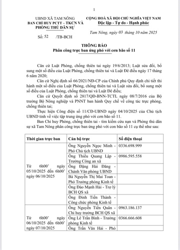 Để sẵn sàng ứng phó bão số 11, chủ động phòng, chống các đợt thiên tai, bão lũ tiếp theo, bảo đảm an toàn tính mạng của Nhân dân, giảm thiệt hại về tài sản của Nhân dân và Nhà nước; thực hiện Công điện số 11/CĐ-UBND ngày 04/10/2025 của Chủ tịch UBND tỉnh về chủ động ứng phó với bão số 11. Chủ tịch UBND xã Tam Nông đã có văn bản yêu cầu các đồng chí Thành viên Ban Chỉ huy Phòng, chống thiên tai - Tìm kiếm cứu nạn và Phòng thủ dân sự xã thực hiện nghiêm chỉ đạo của UBND tỉnh tại Công điện số 11/CĐ-UBND ngày 04/10/2025, tập trung cao độ thực hiện các biện pháp ứng phó hiệu quả với ảnh hưởng của bão số 11 (Matmo).