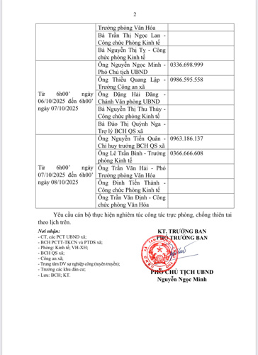 - Kịp thời tham mưu cho Chủ tịch UBND xã tổ chức trực ban nghiêm túc (Thành phần trực PCTT-TKCN gồm các Ông (bà) thành viên BCH PCTT-TKCN và Phòng thủ dân sự xã, cán bộ, công chức có liên quan). Theo dõi chặt chẽ tình hình, đôn đốc chung việc tổ chức thực hiện chỉ đạo của Chủ tịch tỉnh tại Công điện số 11/CĐ-UBND ngày 04/10/2025 và các nội dung tại văn bản này; kịp thời báo cáo, tham mưu Ban Chỉ huy Phòng, chống thiên tai - Tìm kiếm cứu nạn và Phòng thủ dân sự xã, UBND xã, Chủ tịch UBND xã, cấp có thẩm quyền chỉ đạo