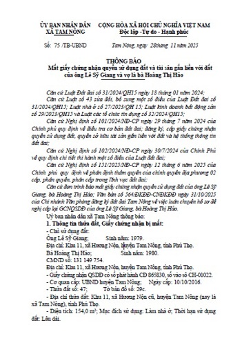 THÔNG BÁO Mất giấy chứng nhận quyền sử dụng đất và tài sản gắn liền với đất của ông Lê Sỹ Giang và vợ là bà Hoàng Thị Hảo