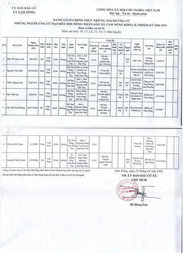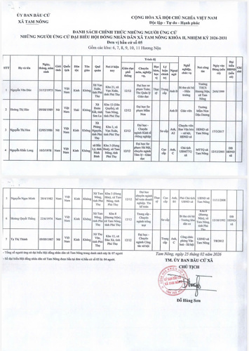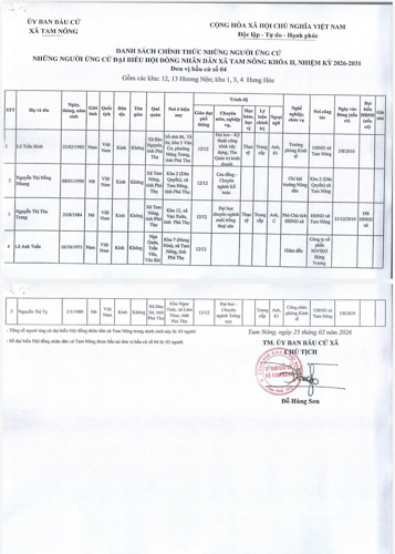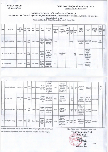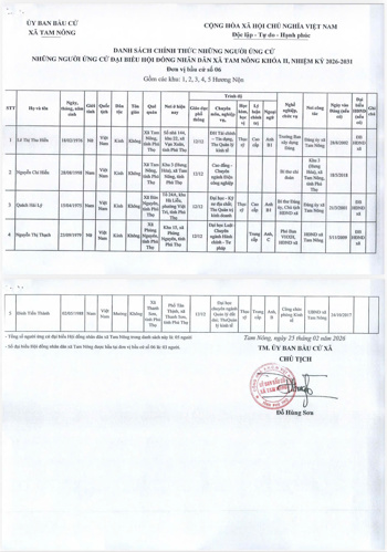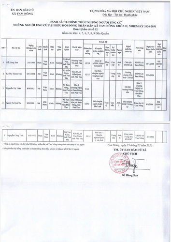 UBBC xã Tam Nông công bố Nghị quyết số 02 ngày 25/2/2026 về công bố Danh sách chính thức các ứng cử viên Đại biểu HĐND xã Tam Nông khoá II, nhiệm kỳ 2026-2031 theo từng đơn vị bầu cử, BBT Trang TTĐT xã Tam Nông xin được trân trọng giới thiệu.