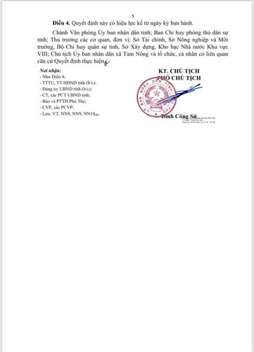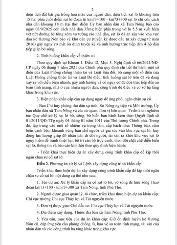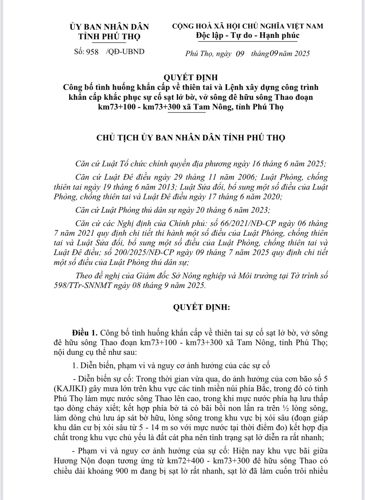 UBND tỉnh Phú Thọ quyết định công bố tình huống khẩn cấp về thiên tai và Lệnh xây dựng công trình khẩn cấp khắc phục sự cố sạt lở bờ, vở sông đê hữu sông Thao đoạn km 73+100 - km 73+300 xã Tam Nông, tỉnh Phú Thọ.