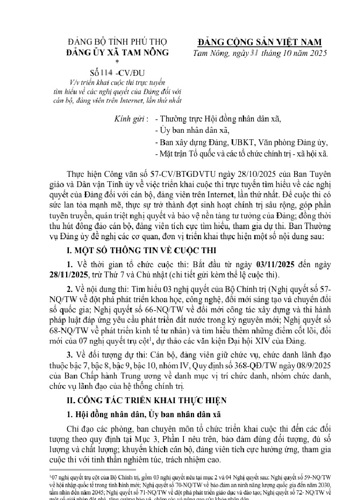 Đảng ủy xã Tam Nông đã có văn bản số 114-CV/ĐU ngày 31/10/2025 về triển khai cuộc thi trực tuyến tìm hiểu về các nghị quyết của Đảng đối với cán bộ, đảng viên trên Internet, lần thứ nhất. Link: https://lyluanchinhtri.dcs.vn/users/login