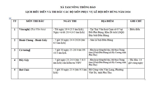 Thực hiện Kế hoạch số 01 của Ban Tổ chức Cụm 07 (Do xã Thanh Thủy - Cụm trưởng và các xã: Vạn Xuân, Hiền Quan, Tam Nông, Đào Xá, Thọ Văn, Tu Vũ) về việc tham gia các hoạt động Giỗ Tổ Hùng Vương, Lễ hội Đền Hùng và Tuần Văn hóa Du lịch Đất Tổ năm Bính Ngọ 2026, xã Tam Nông đã tích cực triển khai và tham gia đầy đủ các nội dung theo kế hoạch đề ra.